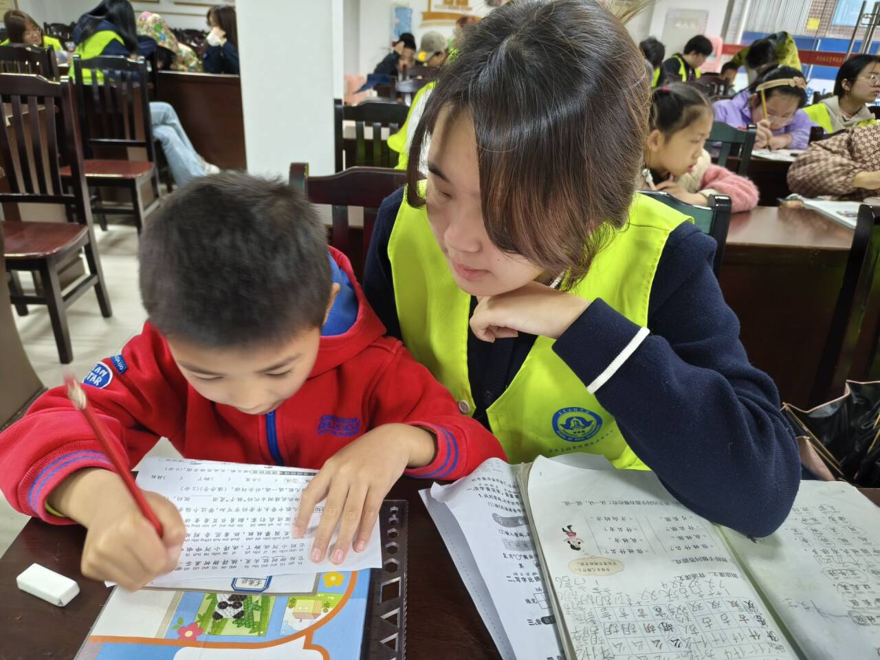 活动现场,青年志愿者们化身暖心“家教老师”,耐心陪伴社区孩子们完成周末作业,针对课业难题逐一细致讲解,梳理知识重难点,用通俗易懂的方式为孩子们答疑解惑。