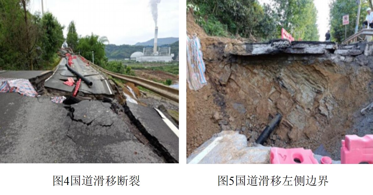 滑坡体位于单斜坡体上,斜坡坡向330~345°,坡度23-35°。斜坡岩层产状与坡向基本一致,且岩层倾角陡。岩性为页岩及砂岩互层,属易滑地层。滑坡体岩体裂隙发育,裂隙倾角大,长期的大气降雨致使层面和裂隙面受地下水浸润形成软弱面。万州环线高速公路建设在隧道施工挖断砂岩岩层形成临空面并且未及时支护,2021年5月3日强降雨使大量的雨水沿裂隙入渗至岩层,使之饱水软化,c、φ值降低,上部斜坡沿岩层层面产生顺层滑动,前缘应力集中后剪切破坏。在牵引作用下上部主滑动区发生顺层滑动。现场效果如图4至图7。