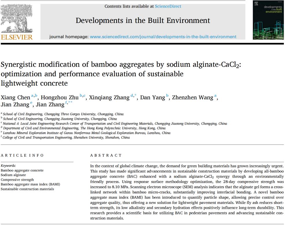 [2] Xiang Chen, Hongzhou Zhu, Xinqiang Zhang, Dan Yang, Zhenzhen Wang, Jian Zhang, Jian Zhang. Synergistic modification of bamboo aggregates by sodium alginate-CaCl2: optimization and performance evaluation of sustainable lightweight concrete[J]. Developments in the Built Environment. 2025, 22, 100670.https://doi.org/10.1016/j.dibe.2025.100670.